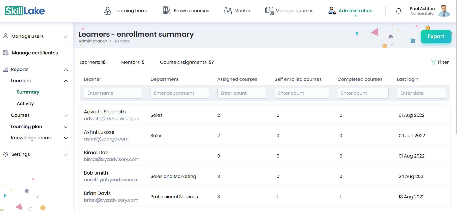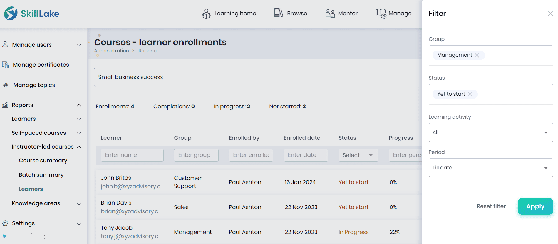 - Administrators can view the learner name, group to which he is part of, reporting manager, count of courses enrolled, completed and feedback received from the learners, learner’s last entry date and previous login date.