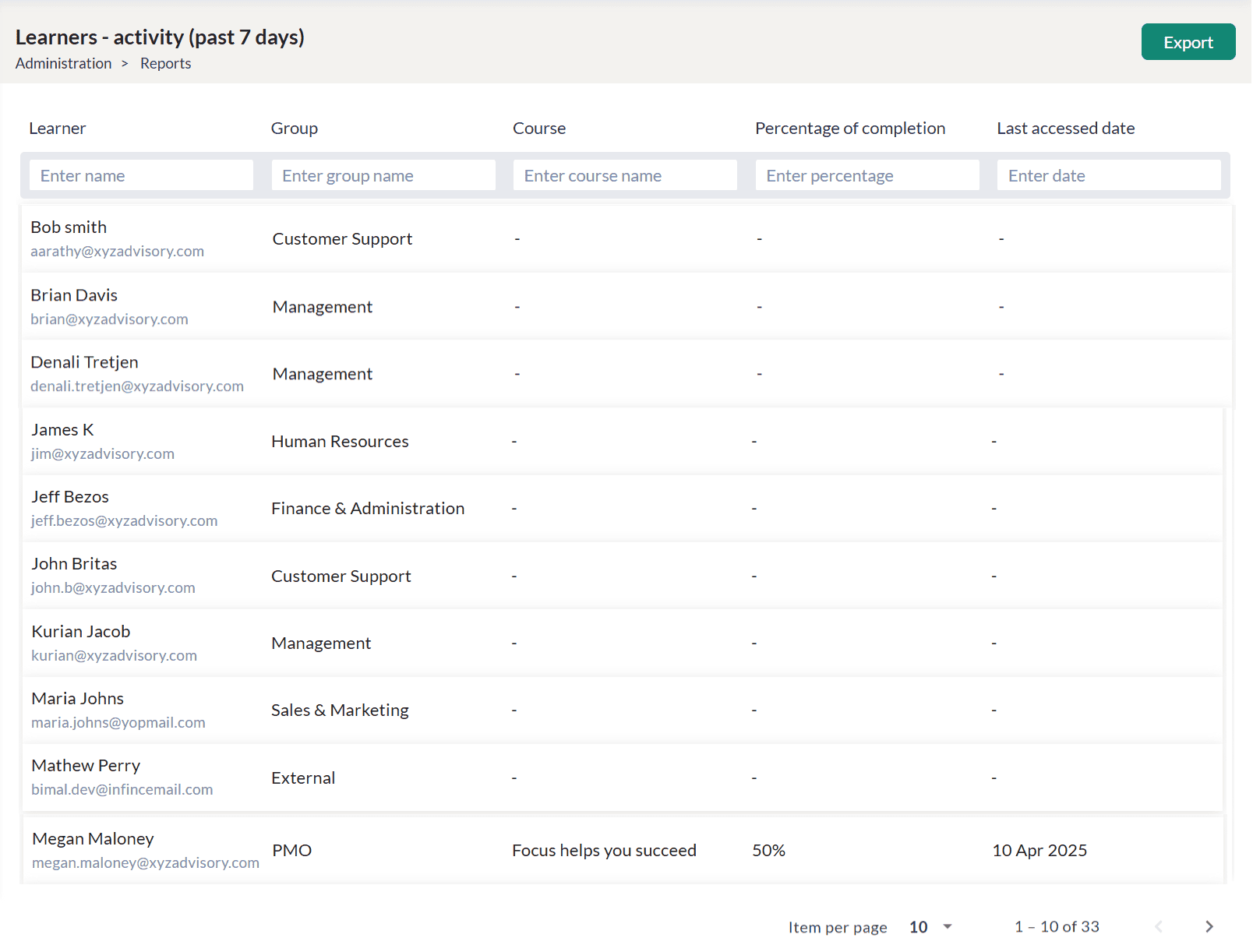- Click the Export button to export the learner’s past activity in CSV format. You can communicate with your learners using the email ids you get while exporting the report to excel.