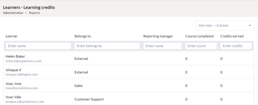 - The administrators can view the name of the learner, group/sub group to which they belong to, reporting manager, count of completed courses, and course credits obtained by the learners.