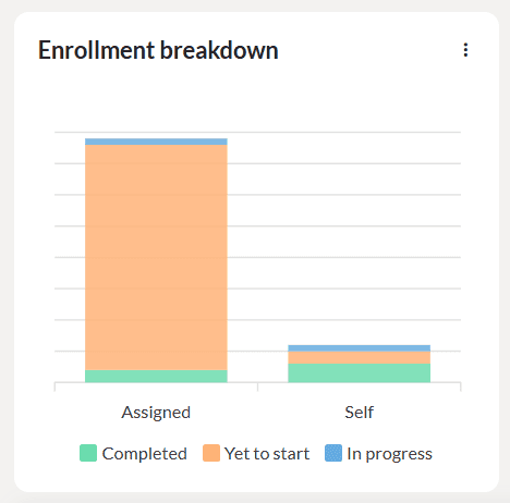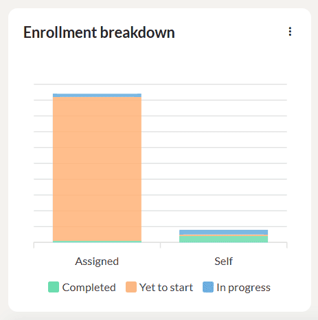 This graph displays the enrollment status of the learners in percentages for the selected period in the completed, in progress and yet to start status. Click on the three dots to download the graph as SVG, PNG or CSV.