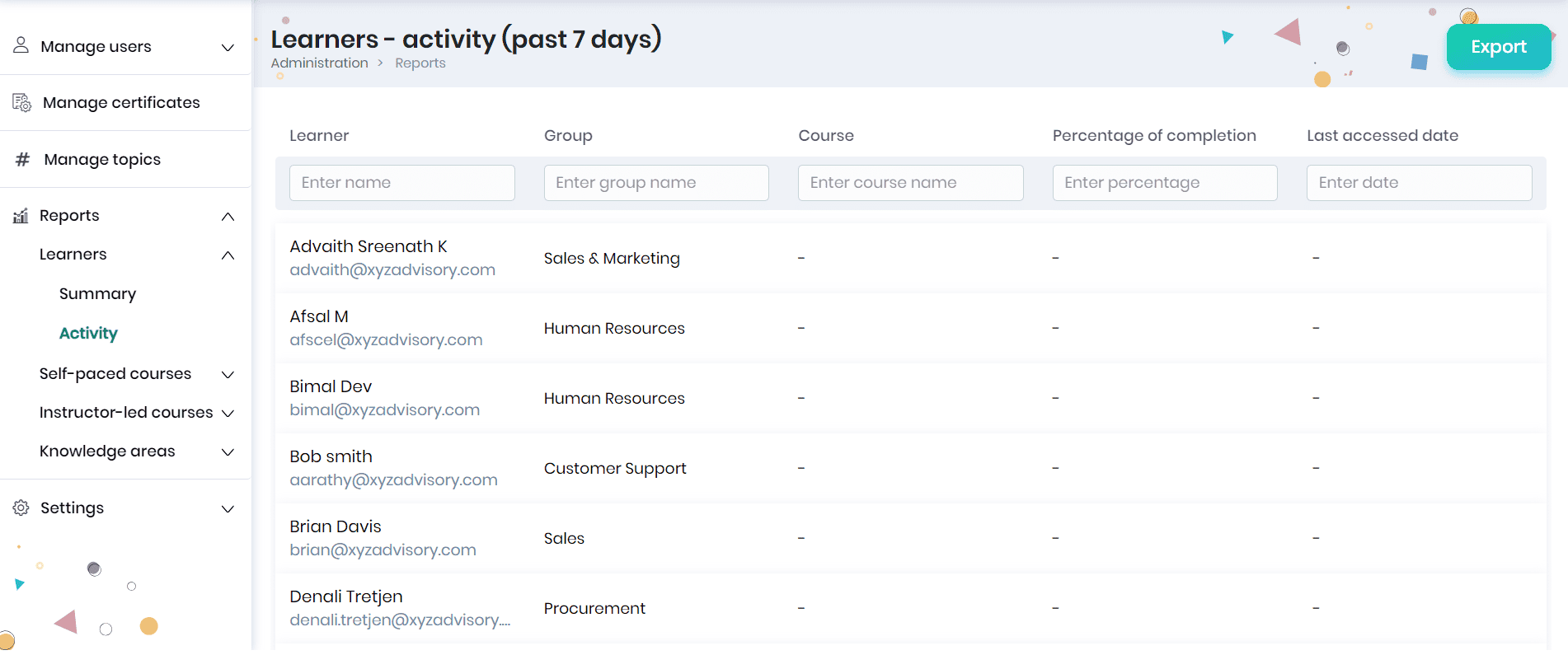 The Administrators can view the past 7 days activities of the learners (of self-paced and instructor-led courses) they manage in the Activity report. You may filter the report based on the learner name, group name, course name, percentage of completion, and learner last accessed date.
