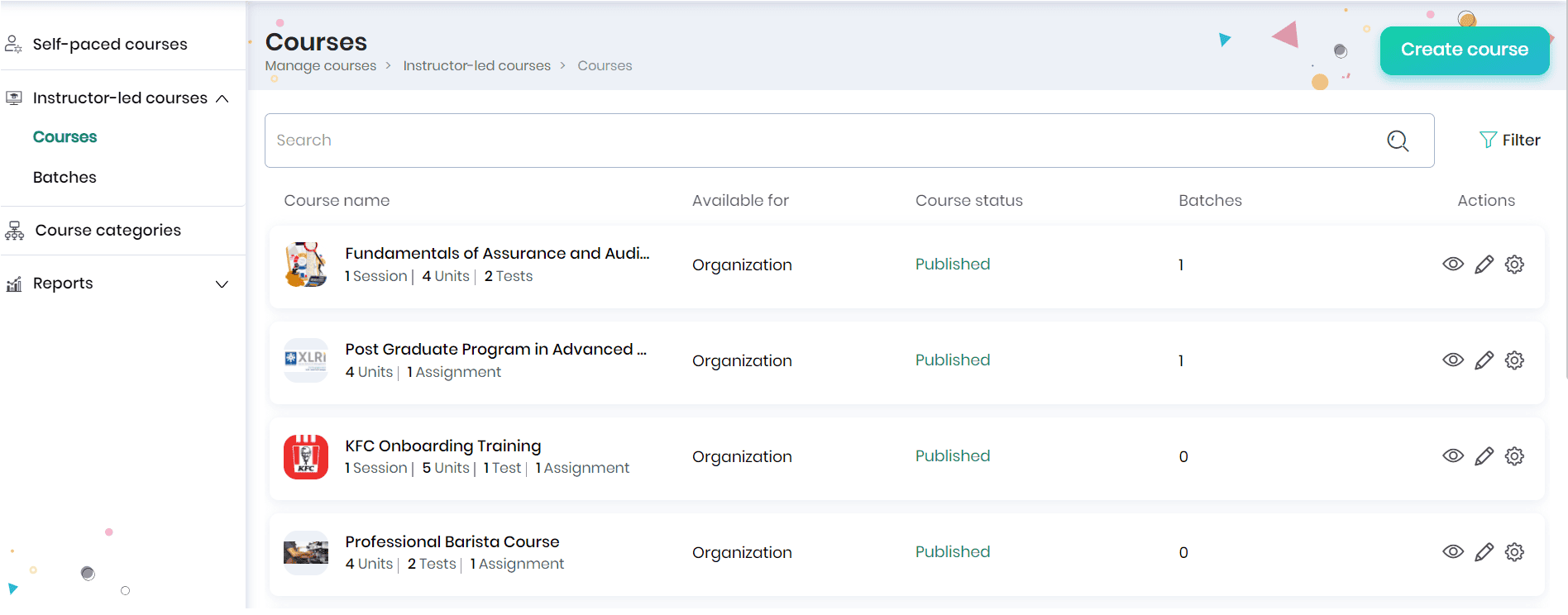 Instructor-led courses are led by an instructor, have definite start and end dates, live sessions, and can include learning materials and tests. Instructor-led courses are not available in the Browse courses tab. The Instructor (users with Instructor privileges), Content Manager (users with Content Manager privileges), or Course Administrator (users with Administrative privileges) has to manage the course enrollments, add/remove the learners, and course attendance. You can decide whether the course offers a certificate by configuring and selecting the certificate template.