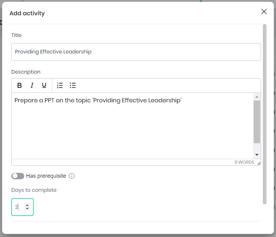 - Toggle the ‘Has prerequisite’ option (if the previous learning item has to be completed before accessing this item), and the expected number of days to complete the activity.