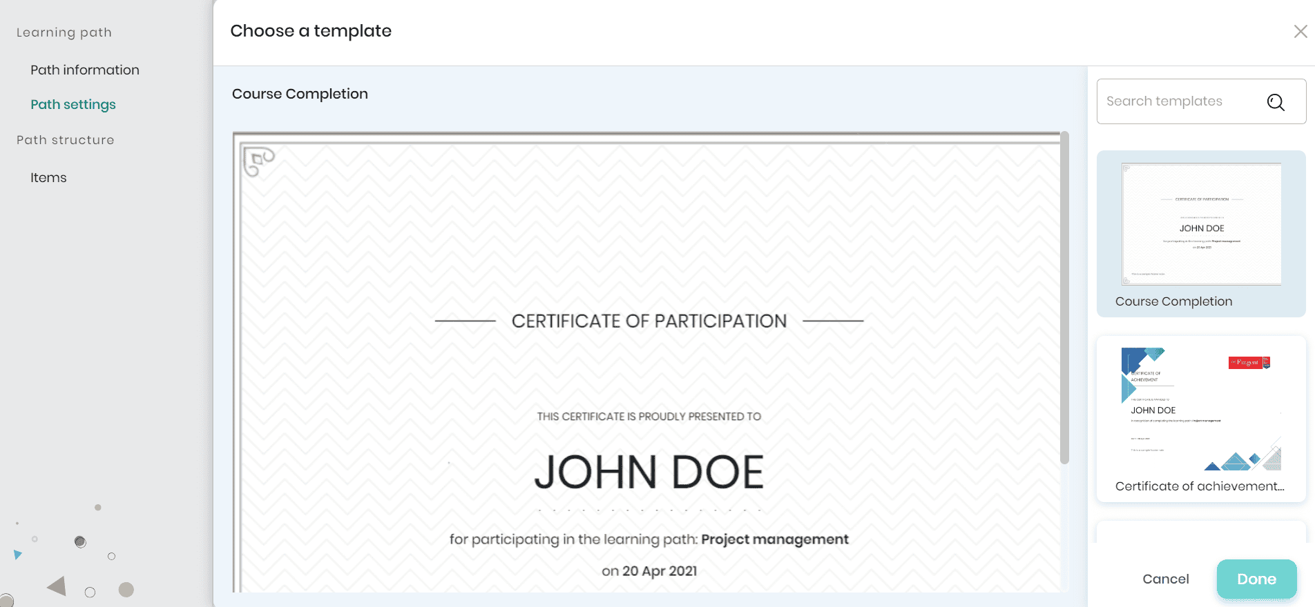 - Click on the below icon to select the certificate template for the learning path from the available templates. Refer to the article Managing Certificates.